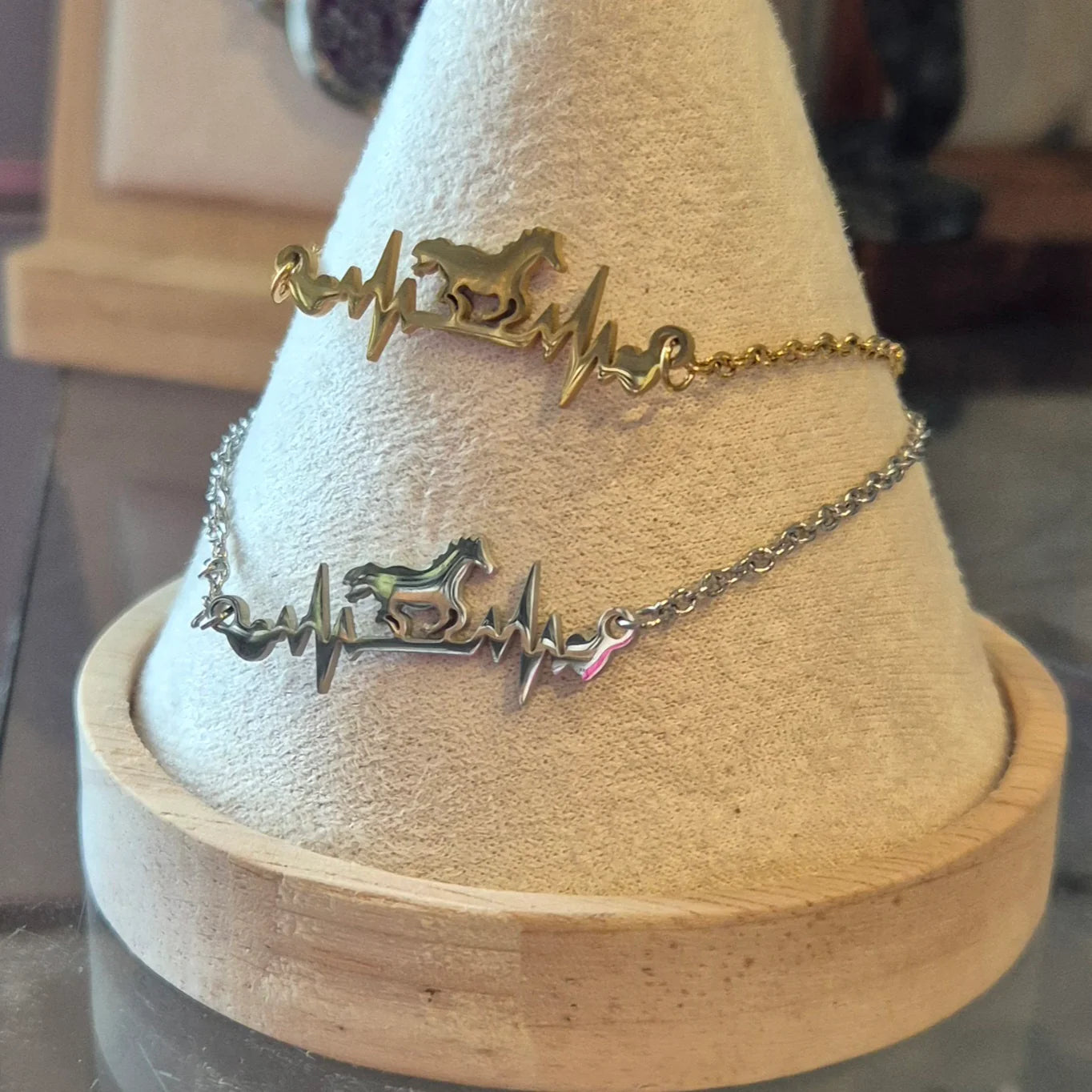 Sa délicate chaîne met en valeur un pendentif original représentant un cheval courant sur une ligne de rythme cardiaque – symbole parfait de la vie, de la liberté et de l’amour équestre.