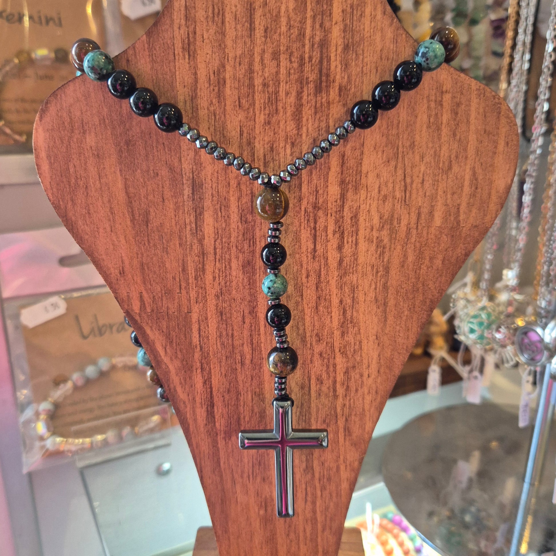 Chaque pierre est soigneusement polie et montée sur un fil solide, se terminant par une croix élégante symbolisant la paix et la foi.