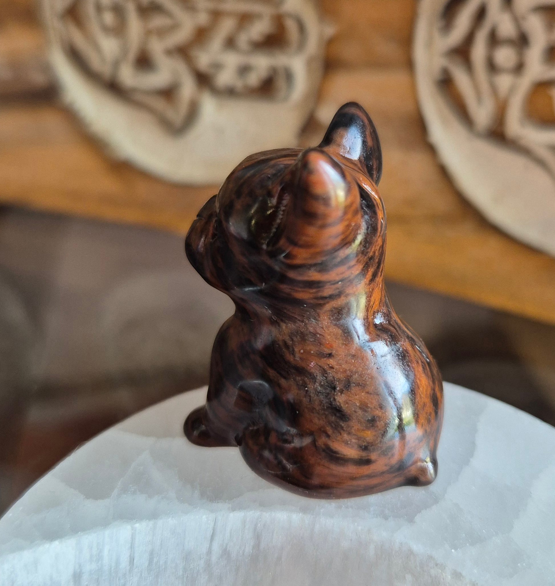 Charmant bulldog en obsidienne rouge naturelle, pierre protectrice qui apporte énergie et ancrage. Sa couleur chaude en fait une pièce originale à collectionner ou offrir.