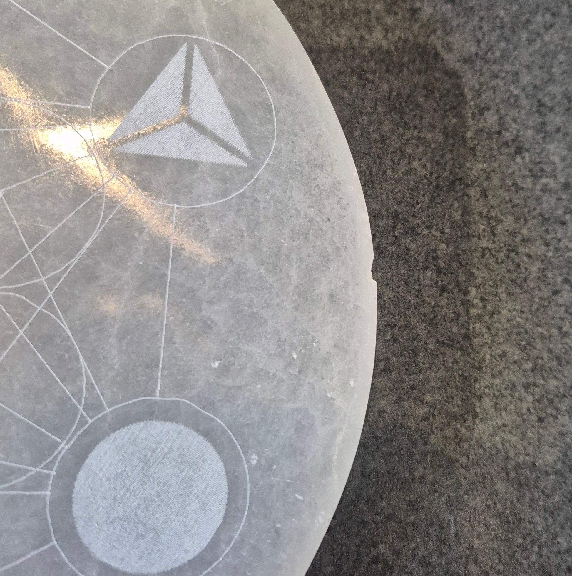 Plaque ronde en sélénite naturelle délicatement gravée avec la cube de Métatron