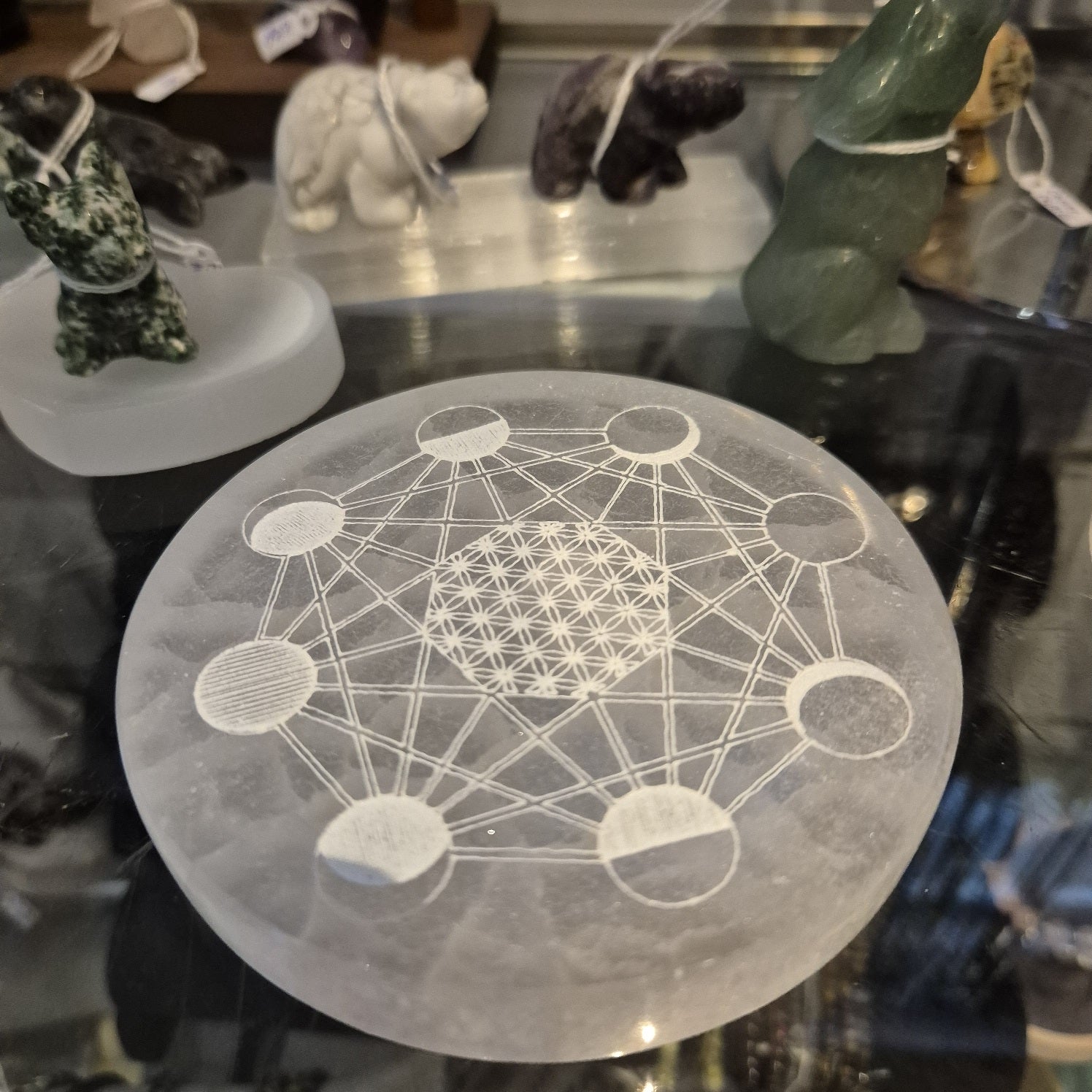 Plaque ronde en sélénite naturelle délicatement gravée des phases de la lune.