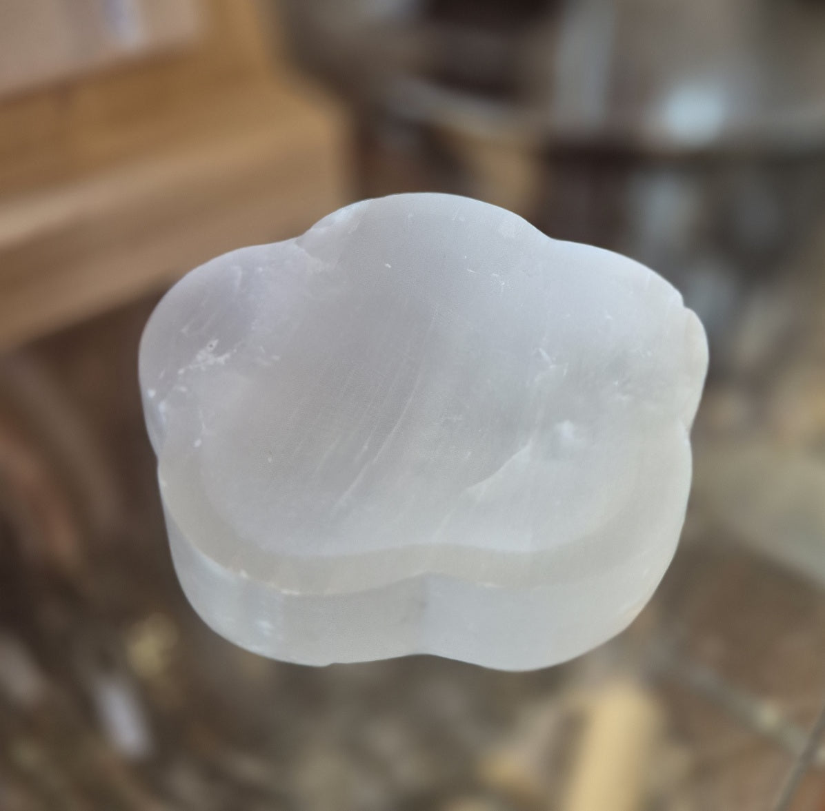 🌸 Plaque/ Bol Fleur en Sélénite - Cette plaque en forme de fleur, taillée dans la sélénite, symbolise l’harmonie et le renouveau. Elle peut servir de support énergétique pour vos cristaux et recharger vos pierres, ou simplement apporter une touche lumineuse à votre décoration.