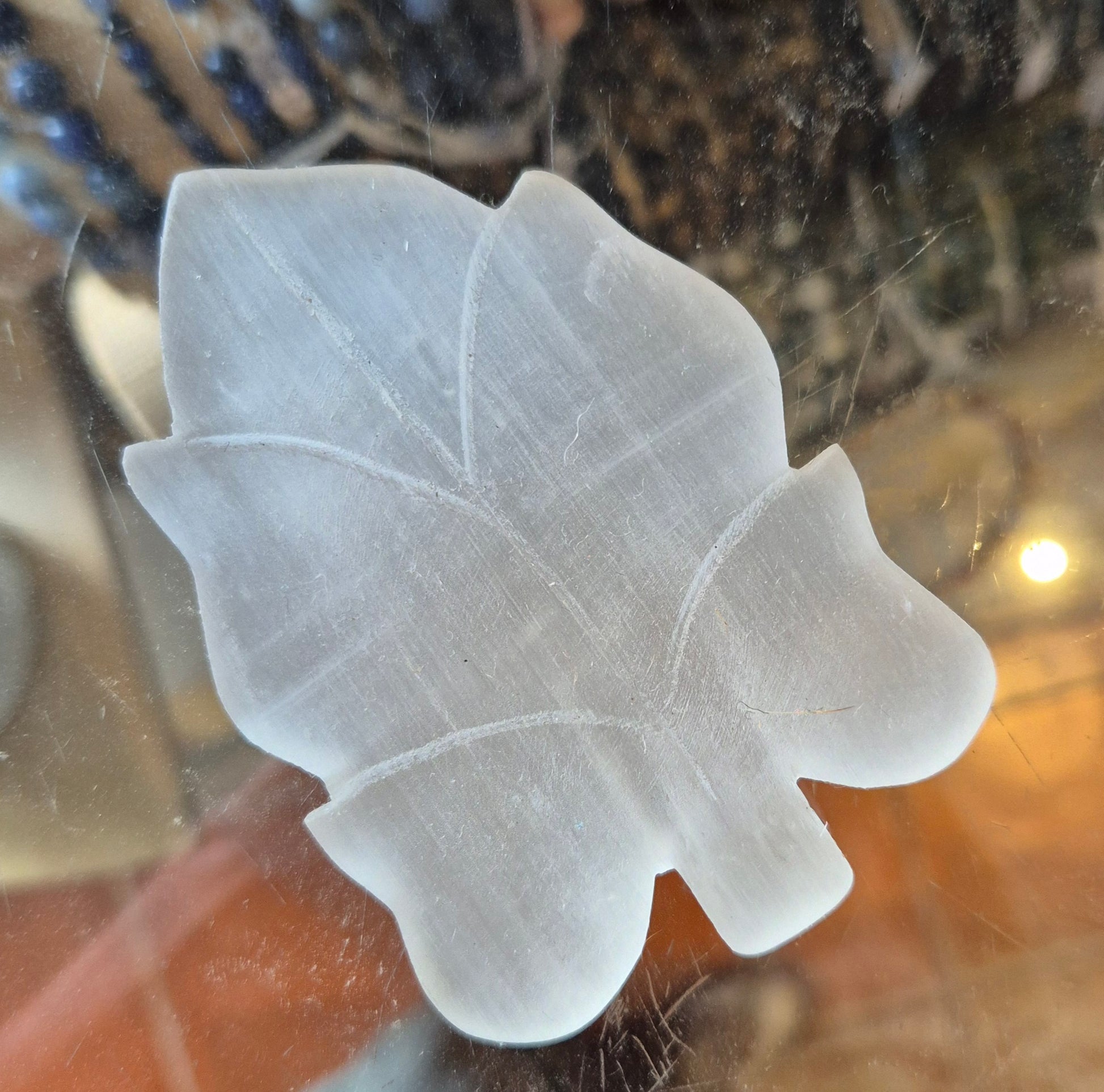 Symbole de renouveau et de croissance, la plaque en sélénite en forme de feuille évoque la légèreté et l’harmonie de la nature.